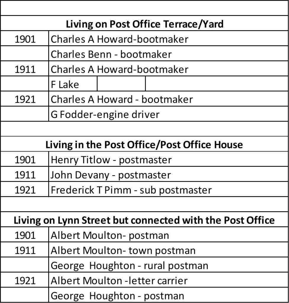 Down the side of each, Post Office Terrace, were buildings, some dwellings, some workshops or barns, so most residents cannot be identified.